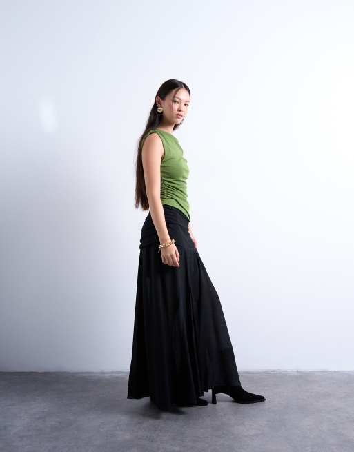 Topshop - Maxi-rok van gedrapeerde stof met verlaagde taille in zwart