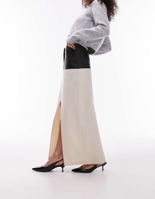 Topshop - Maxi rok van keperstof in crème met contrasterende rand van PU in zwart