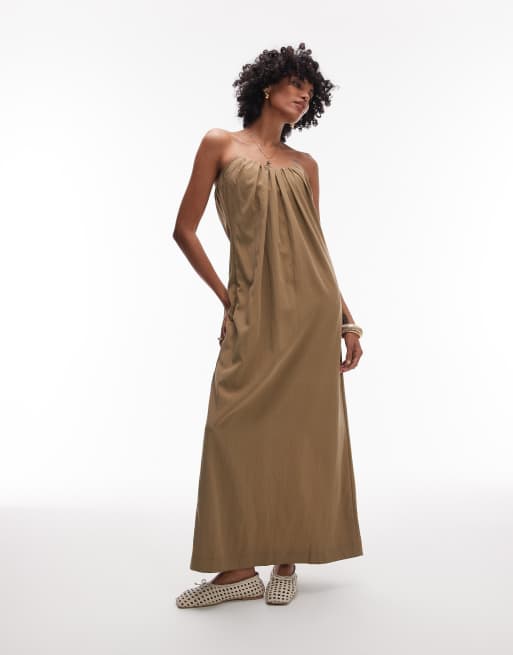 Topshop - Midi bandeau-jurk van popeline met structuur en aangerimpelde buste in kleikleur