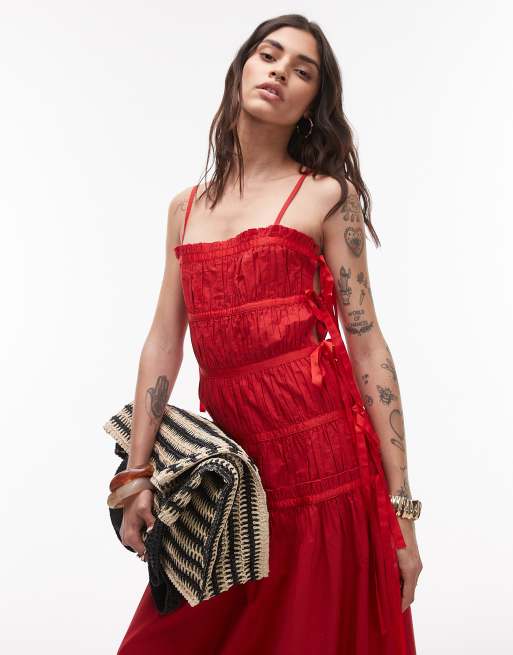 Topshop - Midi-jurk met rimpeleffect en touwtjes aan de zijkanten in rood