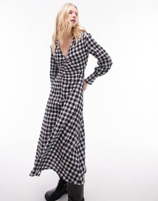 Topshop - Midi jurk met textuur en rits aan de voorkant in zwart-witte ruit