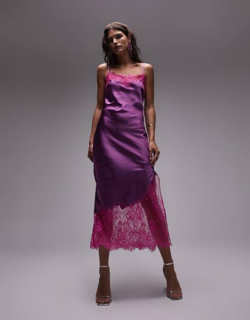 Topshop - Midi slipdress met contrasterend kant in roze en paars