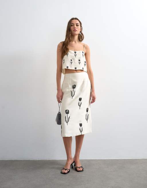 Topshop - Midirok van satijn met borduursels in crème