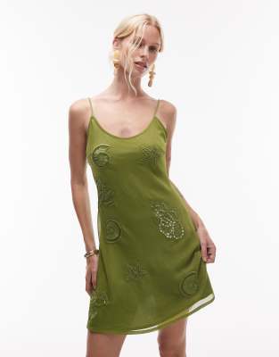 Topshop - Mini-jurk met schelpversiering en lage ronde hals in kaki