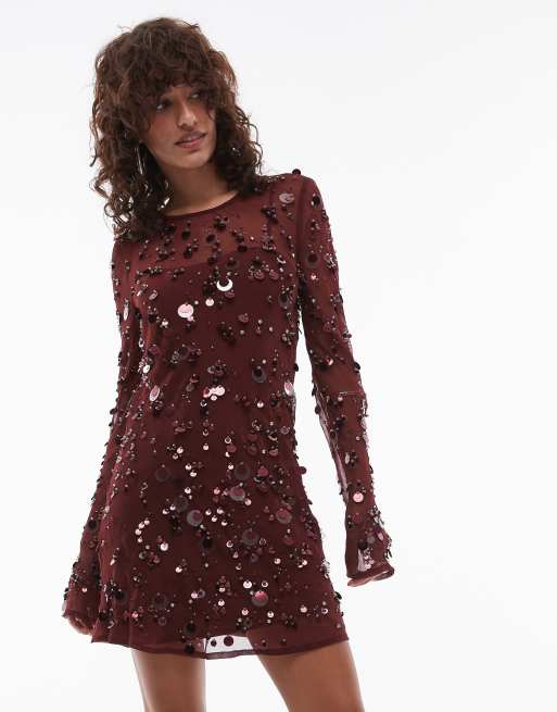 Topshop - Mini-jurk met versiering en lange mouwen in bordeauxrood