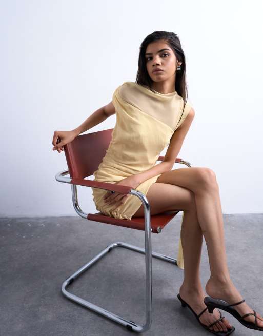Topshop - Mini jurk van chiffon met doorlopende schouderlijn, sjerp en textuur in lichtgeel