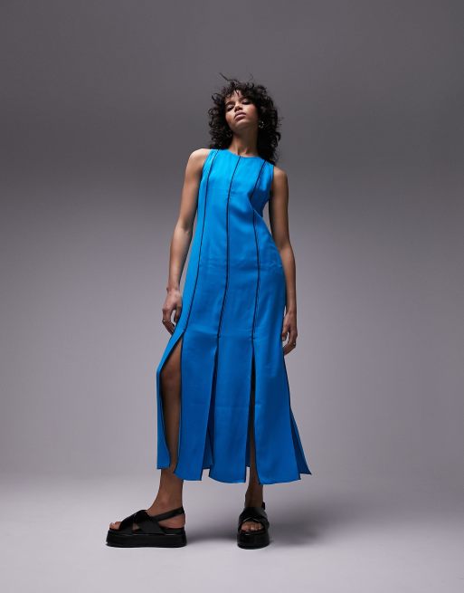 Topshop - Mouwloze midi jurk met contrasterende stiksels en splitten in blauw