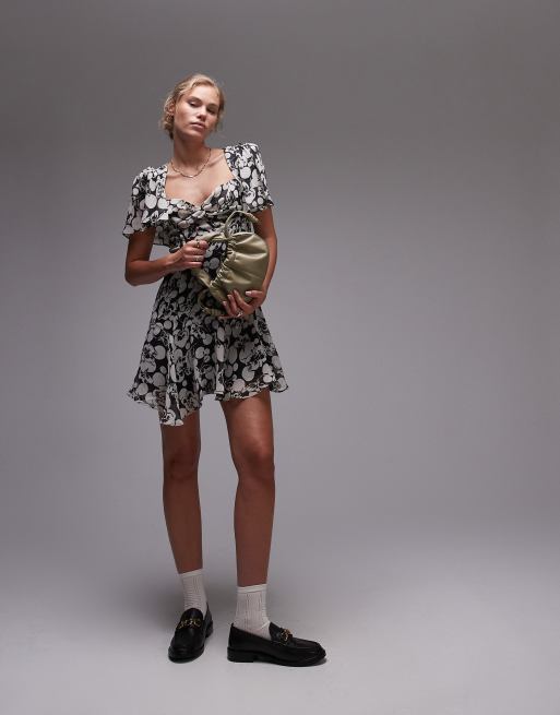 Topshop - Nette mini-jurk met bubbelzoom en bloemenprint in zwart-wit