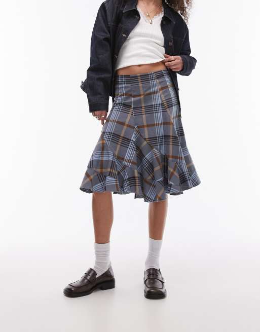 Topshop - Onsamenhangende geruite rok tot aan de knie in blauw en bruin