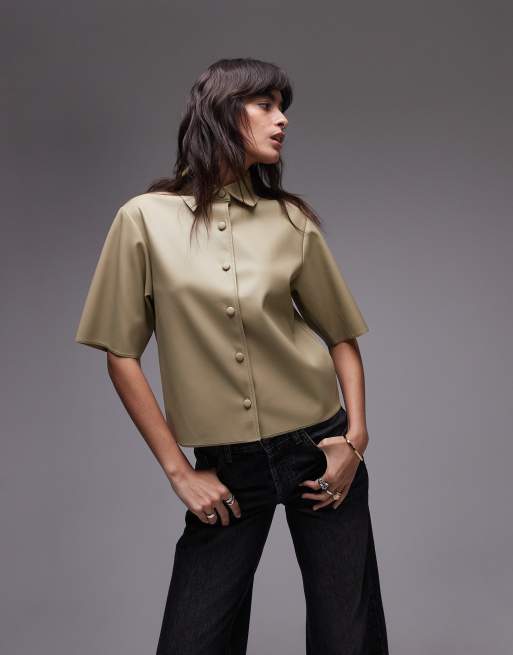 Topshop - Overhemd van imitatieleer met korte mouwen in saliegroen