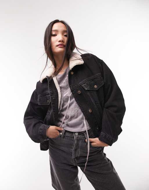 Topshop - Oversized denim jack met borg in zwart met wassing