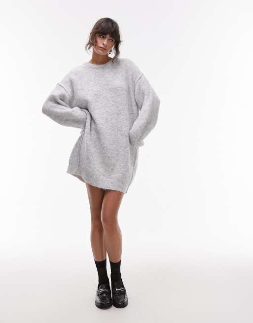 Topshop - Oversized gebreide mini jurk met ronde hals en zichtbare naden in ijsgrijs