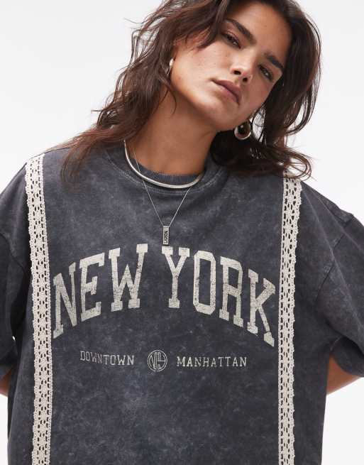 Topshop - Oversized T-shirt met grafische print van New York en kanten afwerking in donkergrijs