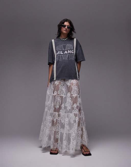 Topshop - Oversized T-shirt met Milano-print en kanten afwerking in antraciet
