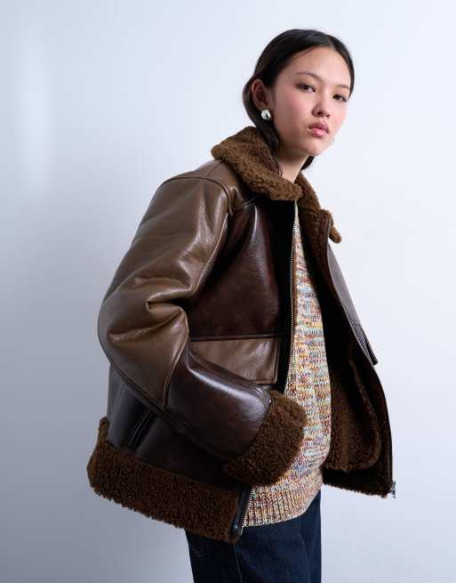 Topshop - Patchwork jack van imitatie-schapenvacht en imitatieleer in bruin