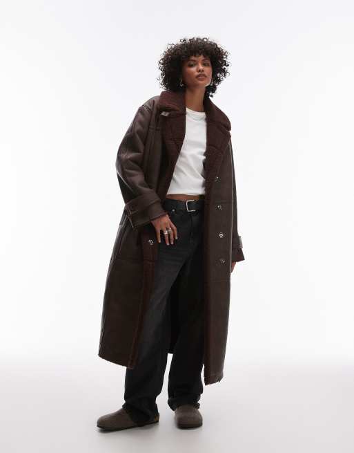 Topshop - Pilotenjack van imitatieleer met imitatieschapenvacht en lange pasvorm in bordeauxrood