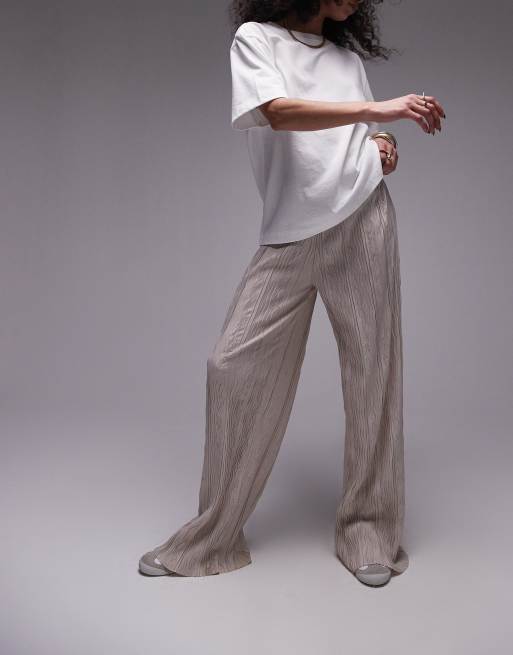 Topshop - Plissé broek met wijde pijpen van kreukelstof in stone