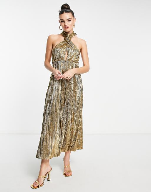 Topshop - Plissé midi-jurk met halternek en uitsnijdingen in goud