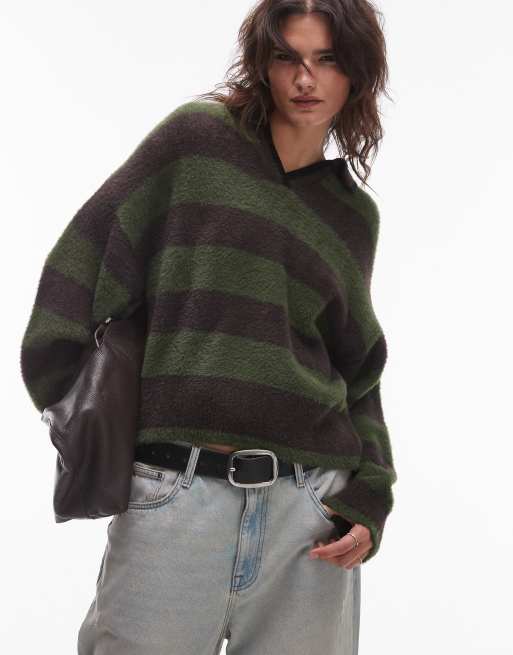 Topshop - Pluizig gebreide ruimvallende gestreepte polo in grijs en groen