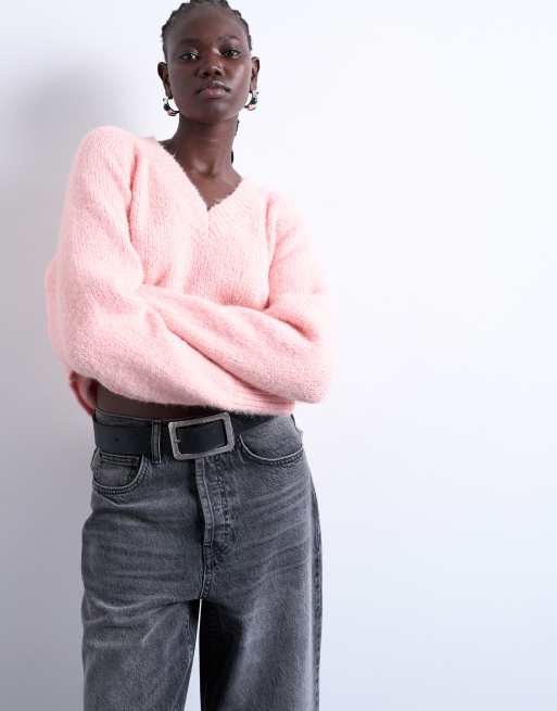 Topshop - Pluizige gebreide trui van wolmix met V-hals in roze