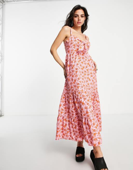 Topshop - Poplin midi jurk met strikje in roze met rode rozenprint van katoenmix - RED
