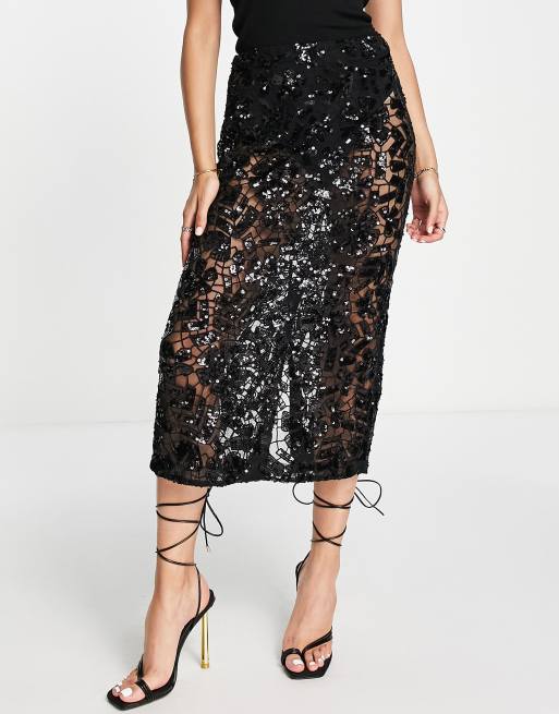 Topshop - Premium - Midi rok van doorschijnend kant met handvormige versiering in zwart
