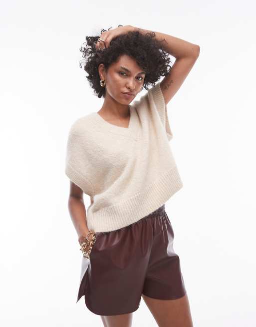 Topshop - Ruimvallend gebreid hemdje met v-hals en siernaden in lichtbeige