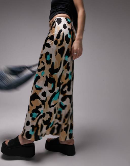 Topshop - Schuingesneden satijnen midi rok met luipaardprint in multi