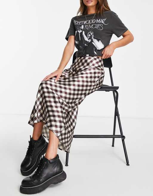 Topshop - Schuingesneden satijnen rok met gingham ruit in chocoladebruin
