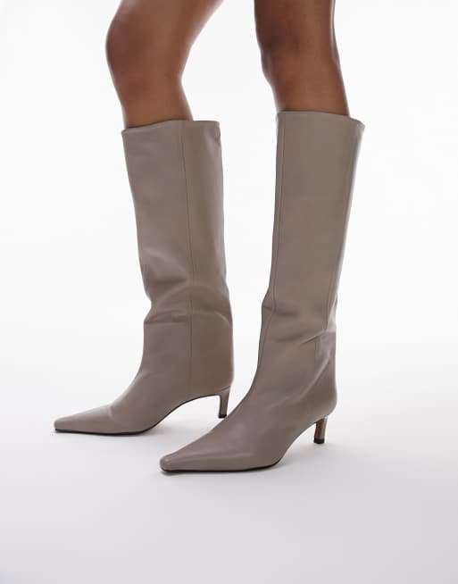 Topshop - Tara - Puntige knielaarzen van premium leer met halfhoge hak in nertsbruin