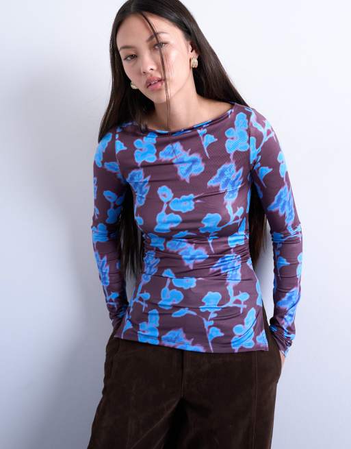 Topshop - Top met lange mouwen, rechte halslijn en abstracte bloemenprint in blauw