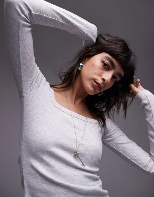 Topshop - Top met vierkante hals en lange mouwen in gemêleerd grijs