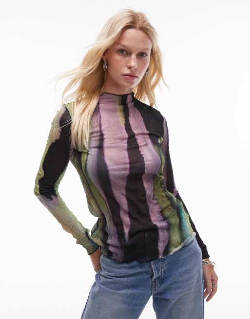 Topshop - Top van kreukelstof met lange mouwen en marmerprint in multi