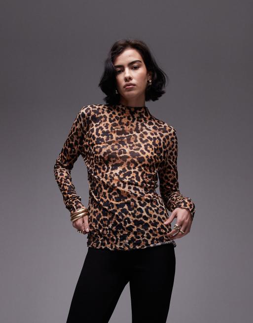 Topshop - Top van kreukelstof met lange mouwen in bruine luipaardprint