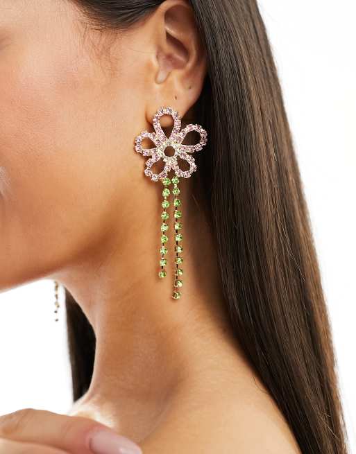 True Decadence - Oversized bloemvormige oorhangers met roze en groene kristallen