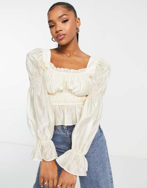 Urban Revivo - Aangerimpelde, satijnene melkmeisjes-top in beige