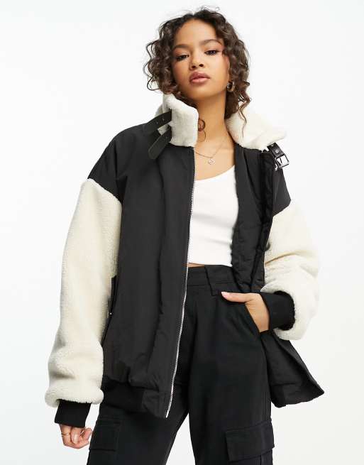 Urban Revivo - Kort bikerjack van teddystof in zwart en wit