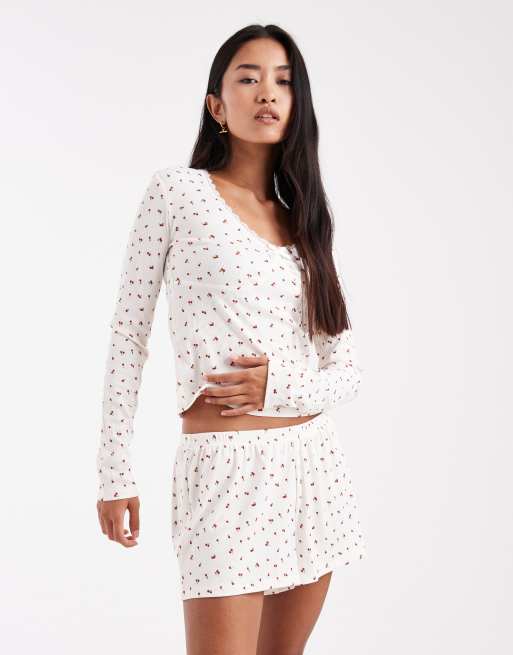 Urban Threads - Geribbelde pyjamashorts met kersenprint in beige