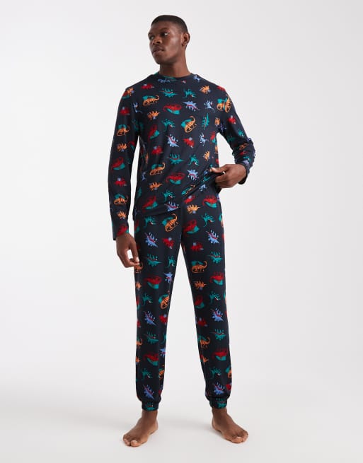 Urban Threads - Kerstmis - T-shirt met lange mouwen en ronde hals en pyjamabroek in marineblauw met dinosaurusprint