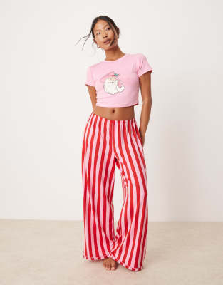 Urban Threads - Petite - Kerstmis - Pyjamaset met T-shirt met korte mouwen en kerstmanprint en gestreepte broek in roze en rood