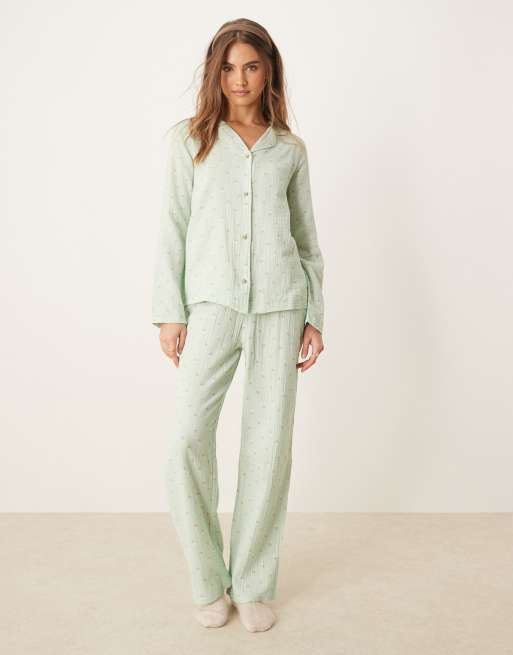Urban Threads - Pyjamaset van overhemd met textuur, lange mouwen en reverskraag en broek met bloemenprint in groen