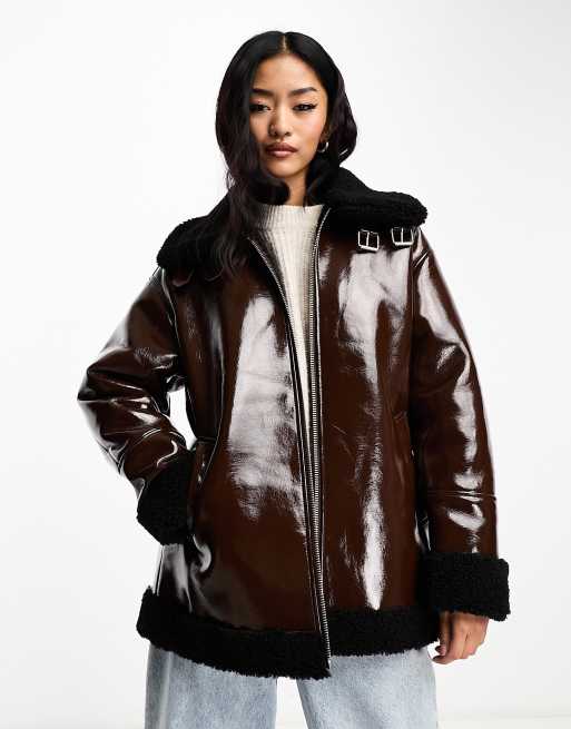 Urbancode - Hoogglanzend pilotenjack met lange pasvorm en borgranden in chocoladebruin