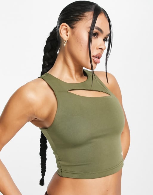 VAI21 - Cropped top met uitsnijding in kaki, deel van een set