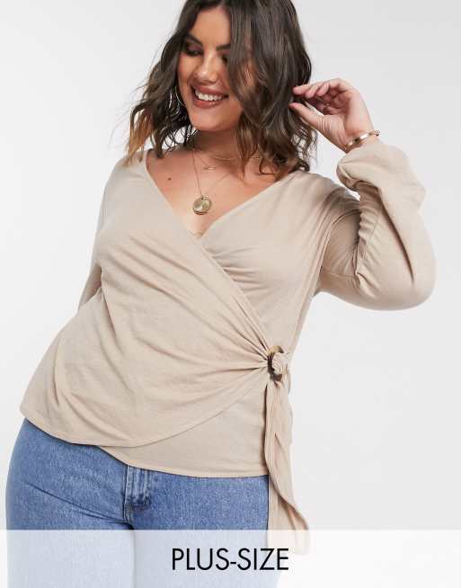 Vero Moda Curve - Blouse met overslag aan de voorkant en tortoise gesp in beige
