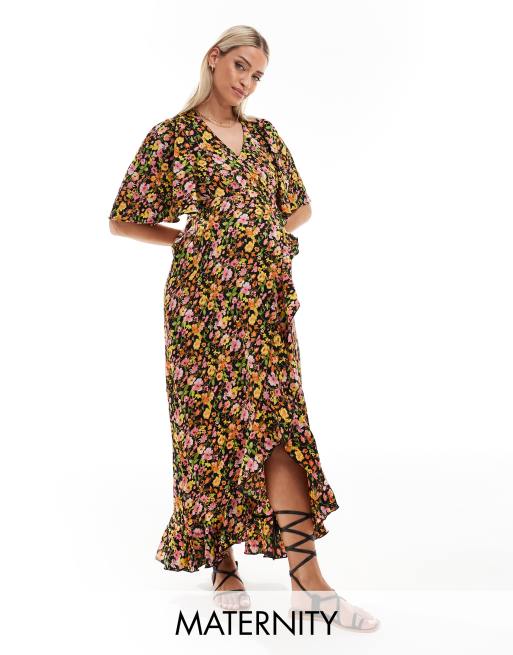 Vero Moda - Zwangerschapskleding - Maxi-jurk met overslag aan de voorkant in donkere bloemenprint
