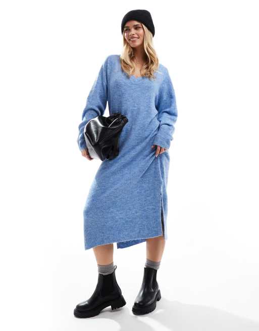 Vero Moda Petite - Oversized gebreide maxi-jurk met V-hals in gemêleerd blauw