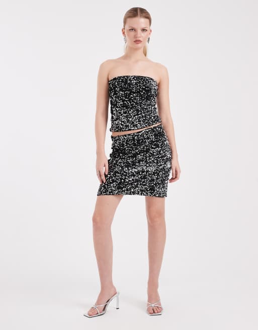 Vero Moda - Co-ord set van getextureerde bandeau top met lovertjes en minirok in zwart en zilver