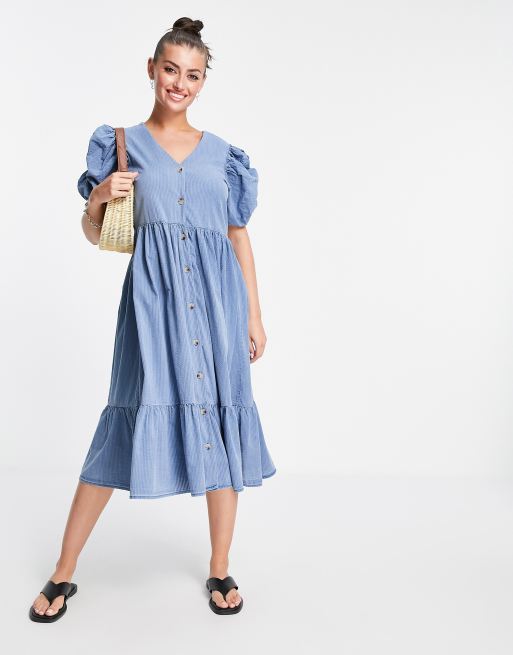Vero Moda - Denim midi jurk met pofmouwen in blauw