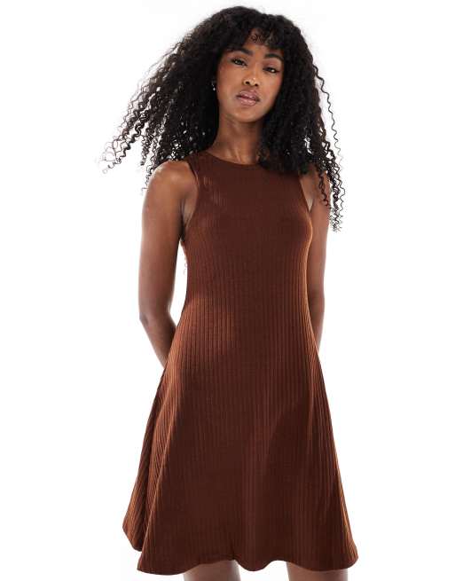 Vero Moda - Geribbelde mini-jurk met racerhals in chocoladebruin