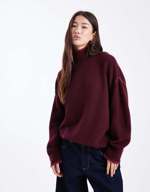 Vero Moda - Hoogsluitende gebreide trui met contrasterende randen in bordeauxrood